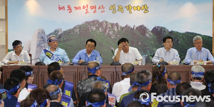 (성주=포커스뉴스) 26일 오전 경북 성주군청을 찾은 정신석 새누리당 원내대표와 지도부들이 성주군민들과 간담회를 갖고 있다.