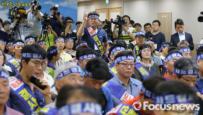 (성주=포커스뉴스) 26일 오전 경북 성주군청을 찾은 정신석 새누리당 원내대표와 지도부에게 성주군민이 질문을 하고 있다.