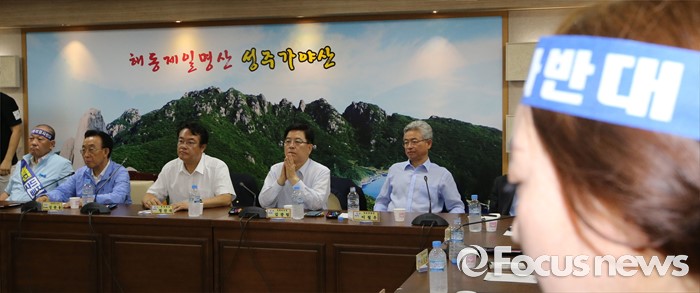 (성주=포커스뉴스) 26일 오전 경북 성주군청을 찾은 정신석 새누리당 원내대표와 지도부들이 성주군민들과 간담회를 갖고 있다.