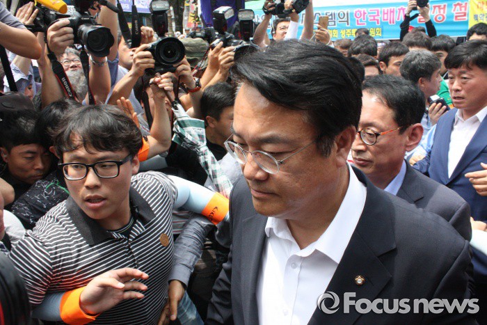 (성주=포커스뉴스) 26일 오후 정진석 새누리당 원내대표와 지도부들이 일정을 마치고 성주군청을 떠나고 있다.