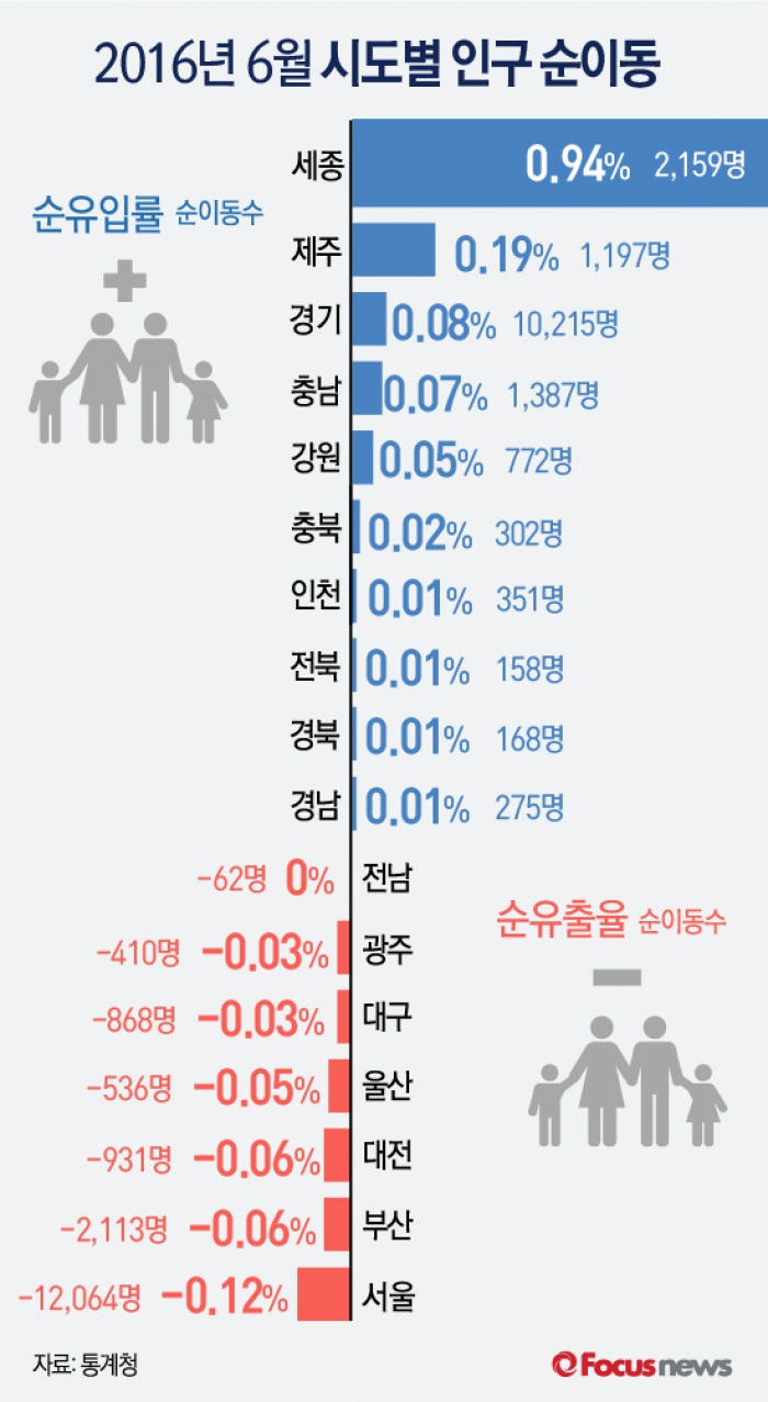 (서울=포커스뉴스) 26일 통계청에 발표한 ‘6월 국내인구이동’에 따르면 6월 시도별 순이동률에서 세종이 0.94%로 가장 높은 순유입률을 보였다 . 반면 서울은 순유출 인구가 -0.12%로 집계됐다.