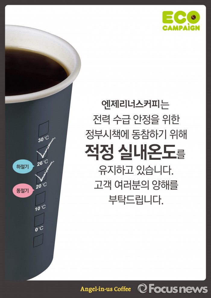한편 산업통상자원부는 다음달 16일까지를 하계 전력수급 대책 기간으로 정하고, 절전 캠페인을 벌인다. 26도 이하 적정 냉방온도 권장, 문 열고 냉방 영업 자제 등이다.엔제리너스는 매장마다 안내문을 비치하고, 여름철 실내 온도를 정부 권장온도인 26도로 유지하고 있다.<사진제공=롯데리아 엔제리너스>
