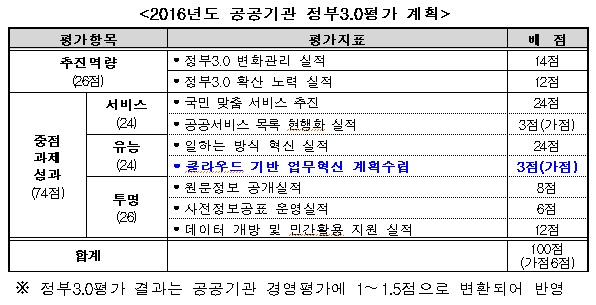 이에 따라 행자부는 정부3.0 평가 시 총 100점의 정부3.0 평가점수에서 공공기관이 2017년에 클라우드를 도입하겠다는 계획서를 제출할 경우 추가적으로 총 3점의 가점을 부여받을 수 있도록 했다.