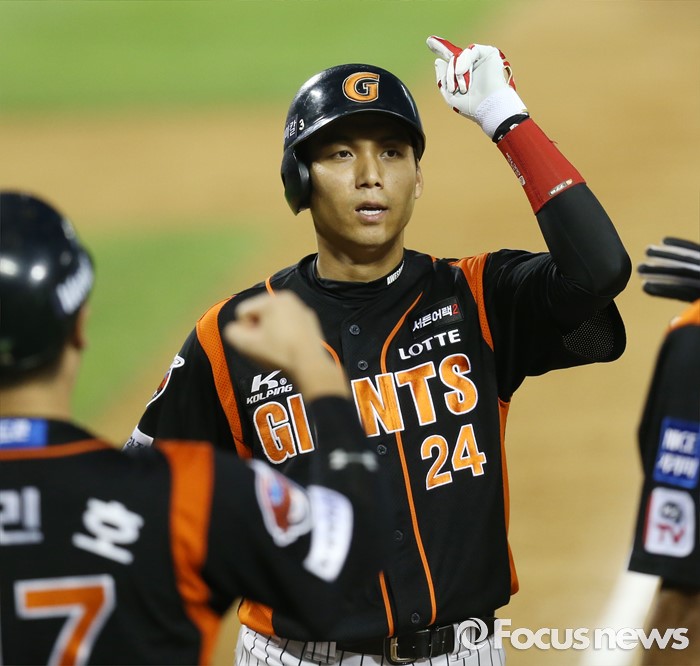 (서울=포커스뉴스) 26일 서울 잠실구장에서 열린 2016 프로야구 롯데-LG 경기 4회초 1사후 롯데 김문호가 우월 만루홈런을 치고 선행 주자들의 환영을 받으며 홈인하고 있다.