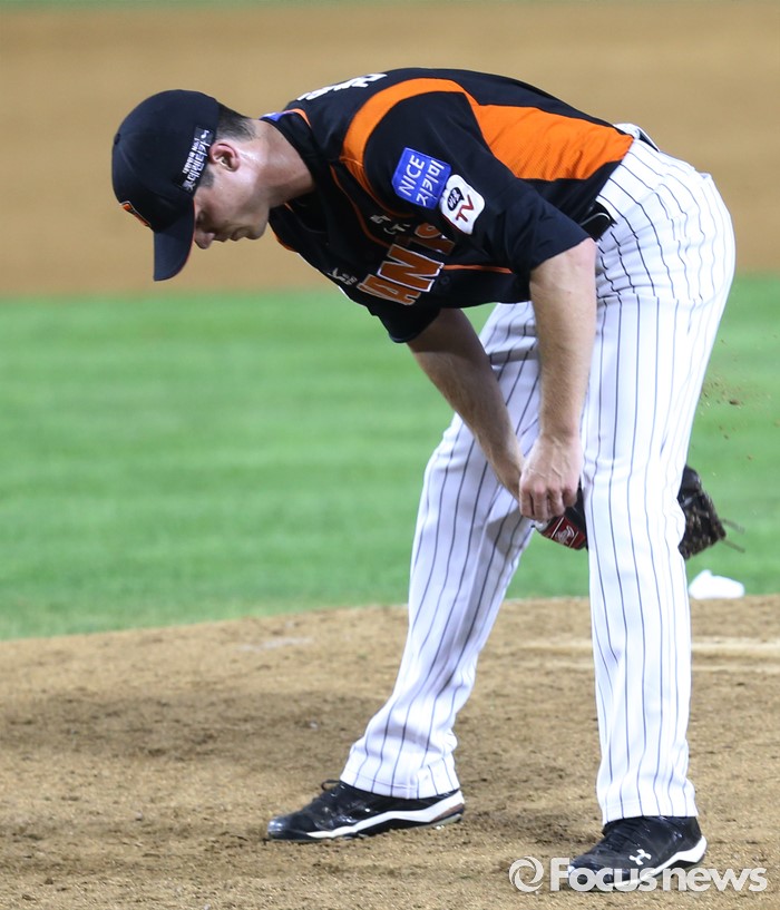 (서울=포커스뉴스) 26일 서울 잠실구장에서 열린 2016 프로야구 롯데-LG 경기 4회말 1사 3루에서 롯데 투수 레일리가 LG 김용의에게 중전 적시타를 맞고 실망하며 일어나고 있다.