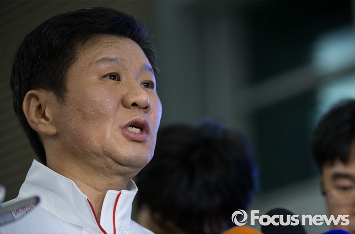 (인천공항=포커스뉴스) 남미에서 최초로 열리는 제31회 브라질 리우데자네이루 하계올림픽 대한민국 선수단을 이끄는 정몽규 선수단장이 26일 오후 인천국제공항에서 출국 전 취재진 질문에 답변하고 있다.