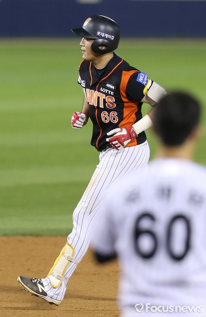 (서울=포커스뉴스) 26일 서울 잠실구장에서 열린 2016 프로야구 롯데-LG 경기 8회초 롯데 선두타자 김상호가 좌중월 홈런을 치고 베이스를 돌고 있다.