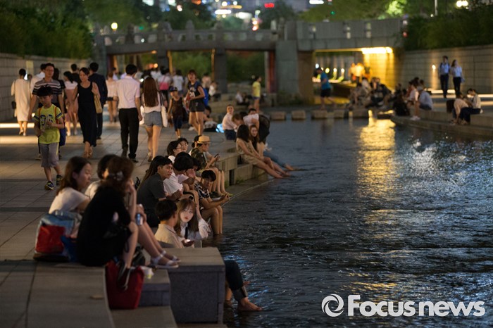 (서울=포커스뉴스) 서울과 전국 대분분 지역이 열대야인 26일 오후 서울 종로구 청계천을 찾은 시민들이 더위를 식히고 있다.