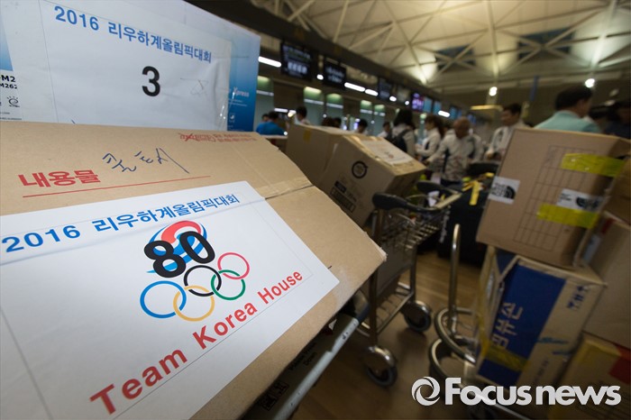 (인천공항=포커스뉴스) 남미에서 최초로 열리는 제31회 브라질 리우데자네이루 하계올림픽에 참가하는 대한민국 국가대표팀 선수들이 26일 오후 인천국제공항에서 출국 전 짐 정리를 하고 있다.