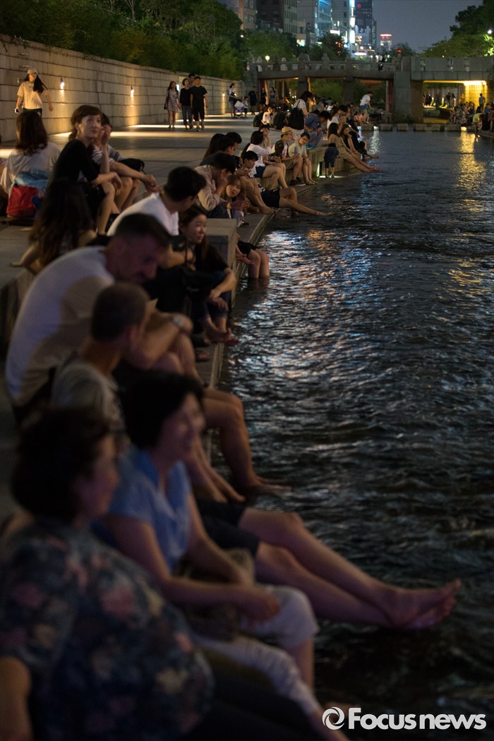 (서울=포커스뉴스) 서울과 전국 대분분 지역이 열대야인 26일 오후 서울 종로구 청계천을 찾은 시민들이 더위를 식히고 있다.