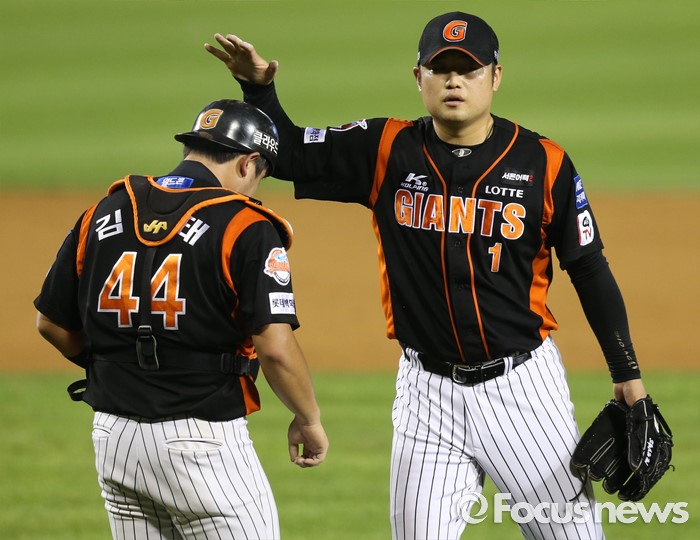 (서울=포커스뉴스) 26일 서울 잠실구장에서 열린 2016 프로야구 롯데-LG 경기에서 LG에 12-10으로 2점차 승리한 롯데의 마무리 투수 손승락이 포수 김준태의 헬멧을 두드리고 있다.