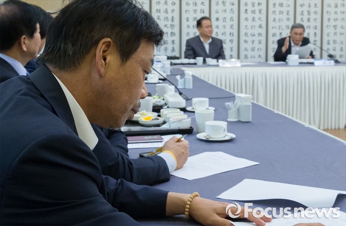(서울=포커스뉴스) 27일 오전 서울 여의도 국회 귀빈식당에서 야3당 소속 의원들 주최로 열린 사드사태와 그 대응전략 간담회에 참석한 이완영(경북 고령·성주·칠곡군) 새누리당 의원이 이종석 전 통일부 장관의 발언을 듣고 있다.