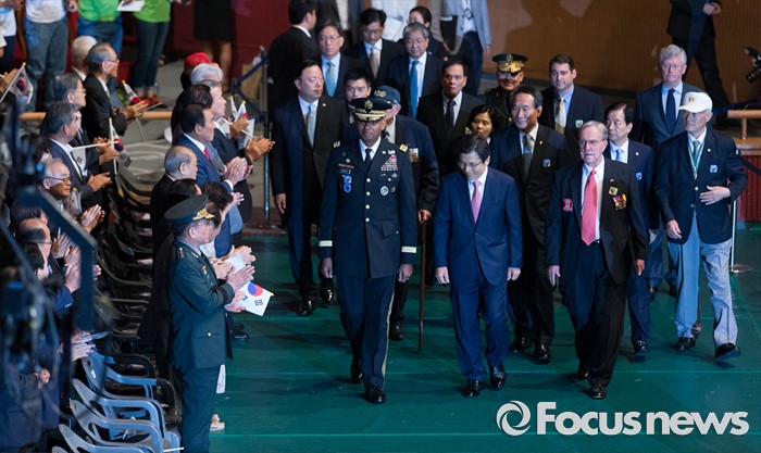 (서울=포커스뉴스) 27일 오전 서울 송파구 올림픽공원 올림픽홀에서 열린 정전협정 63주년 및 유엔군 참전의 날 기념식에서 황교안 국무총리와 빈센트 브룩스 유엔군 사령관이 6·25 전쟁 유엔군 참전용사들과 입장하고 있다.