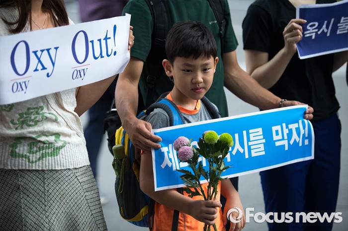 (서울=포커스뉴스) 27일 오전 서울 영등포구에 위치한 옥시레킷벤키저 본사 앞에서 가습기살균제참사전국네트워크 회원들이 '제2의 옥시를 막자-가습기살균제사고 기업 현장조사' 기자회견을 하고 있다.
