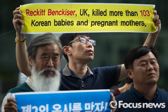 (서울=포커스뉴스) 27일 오전 서울 영등포구에 위치한 옥시레킷벤키저 본사 앞에서 가습기살균제참사전국네트워크 회원들이 '제2의 옥시를 막자-가습기살균제사고 기업 현장조사' 기자회견을 하고 있다.