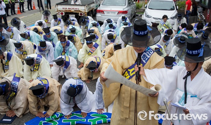 (서울=포커스뉴스) 27일 오전 서울 종로구 청운효자동 주민자치센터 앞에서 열린 '사드 배치 반대 기자회견'에 참석한 성주 유림단체 회원들이 상소문을 낭독하고 있다.