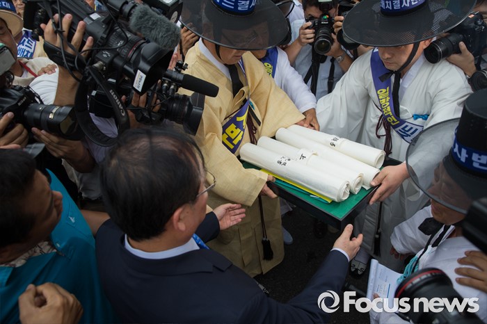 (서울=포커스뉴스) 27일 오전 서울 종로구 청운효자동 주민자치센터 앞에서 열린 '사드 배치 반대 기자회견'에 참석한 청와대 국민소통비서관이 성주 유림단체 회원들로부터 상소문을 전달받고 있다.