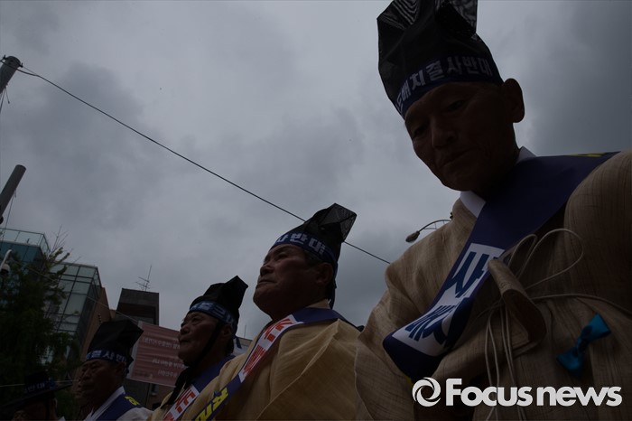 (서울=포커스뉴스) 27일 오전 서울 종로구 청운효자동 주민자치센터 앞에서 열린 '사드 배치 반대 기자회견'에 참석한 성주 유림단체 회원들 위로 먹구름이 드리우고 있다.