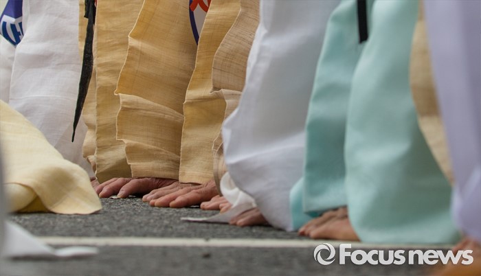 (서울=포커스뉴스) 27일 오전 서울 종로구 청운효자동 주민자치센터 앞에서 열린 '사드 배치 반대 기자회견'에 참석한 성주 유림단체 회원들이 무릎 꿇고 있다.