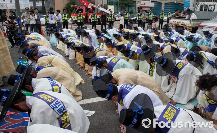 (서울=포커스뉴스) 27일 오전 서울 종로구 청운효자동 주민자치센터 앞에서 열린 '사드 배치 반대 기자회견'에 참석한 성주 유림단체 회원들이 무릎 꿇고 있다.