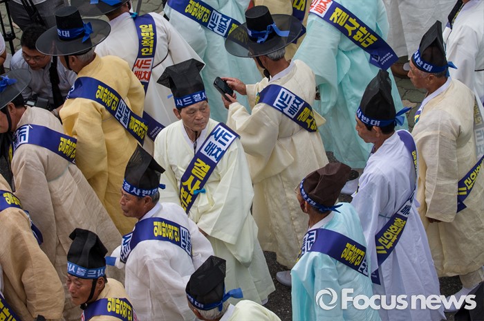 (서울=포커스뉴스) 27일 오전 서울 종로구 청운효자동 주민자치센터 앞에서 열린 '사드 배치 반대 기자회견'에 참석한 성주 유림단체 회원들이 선정 기준에 대한 투명한 정보공개를 요구하고 있다.