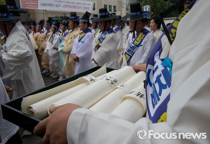 (서울=포커스뉴스) 27일 오전 서울 종로구 청운효자동 주민자치센터 앞에서 열린 '사드 배치 반대 기자회견'에 참석한 성주 유림단체 회원이 상소문을 들고 있다.