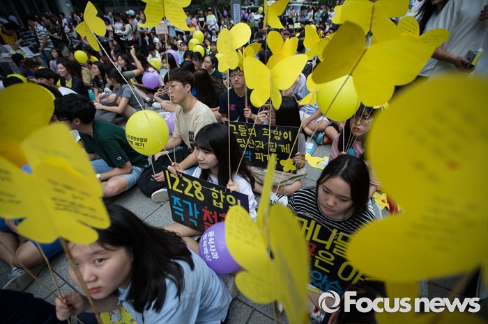 (서울=포커스뉴스) 27일 오후 서울 종로구 옛 일본대사관 앞에서 제1241차 일본군 위안부 문제해결을 위한 정기 수요집회가 열리고 있다.