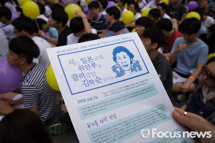 (서울=포커스뉴스) 27일 오후 서울 종로구 옛 일본대사관 앞에서 제1241차 일본군 위안부 문제해결을 위한 정기 수요집회가 열리고 있다.