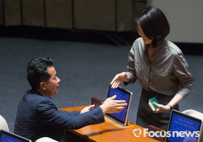 (서울=포커스뉴스) 27일 오후 서울 여의도 국회에서 열린 344회 국회(임시회) 3차 본회의에 김수민(오른쪽) 국민의당 의원이 참석해 동료 의원들과 악수하고 있다.