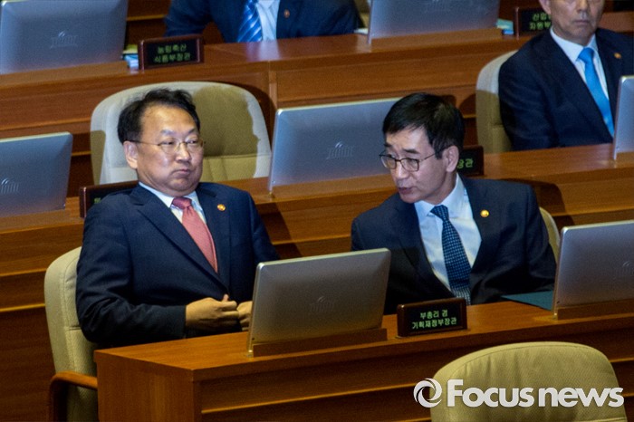 (서울=포커스뉴스) 유일호(왼쪽) 경제부총리 겸 기획재정부 장관과 이준식 사회부총리 겸 교육부 장관이27일 오후 서울 여의도 국회에서 열린 344회 국회(임시회) 3차 본회의에 참석해 대화 하고 있다.