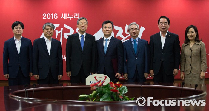 (서울=포커스뉴스) 27일 오후 서울 영등포구 여의도 새누리당 당사에서 열린 윤리위원회 위원 임명장 수여식이 끝난 뒤 참석자들이 함께 기념사진을 찍고 있다. 왼쪽 세번째부터 김희옥 혁신비대위원장, 박요찬 현 새누리당 경기도당 윤리위원회 위원, 이진곤 새누리당 중앙윤리위원장, 전주혜(오른쪽 첫번째) 전 서울중앙지법 부장판사.