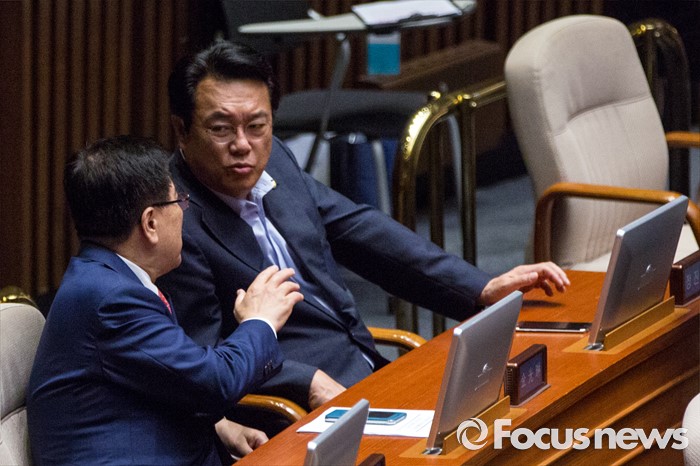 (서울=포커스뉴스) 정진석(오른쪽) 새누리당 원내대표와 김광림 정책위의장이 27일 오후 서울 여의도 국회에서 열린 344회 국회(임시회) 3차 본회의에 참석해 대화 하고 있다.