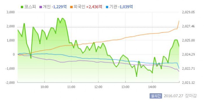 이날 코스피는 전일 대비 0.01% 내린 2027.07로 장을 시작했다. 이후 지수는 보합권에서 등락을 거듭했다.