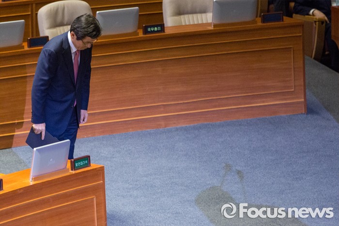 (서울=포커스뉴스) 황교안 국무총리가 27일 오후 서울 여의도 국회에서 열린 344회 국회(임시회) 3차 본회의에 참석해 추가경정예산안과 관련한 시정연설을 하기 위해 연단으로 향하며 정세균 국회의장에게 인사 하고 있다.
