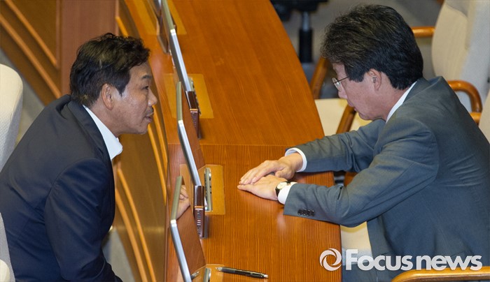 (서울=포커스뉴스) 27일 오후 서울 여의도 국회에서 열린 344회 국회(임시회) 3차 본회의에 참석한 유승민(오른쪽), 이완영 새누리당 의원이 대화하고 있다.