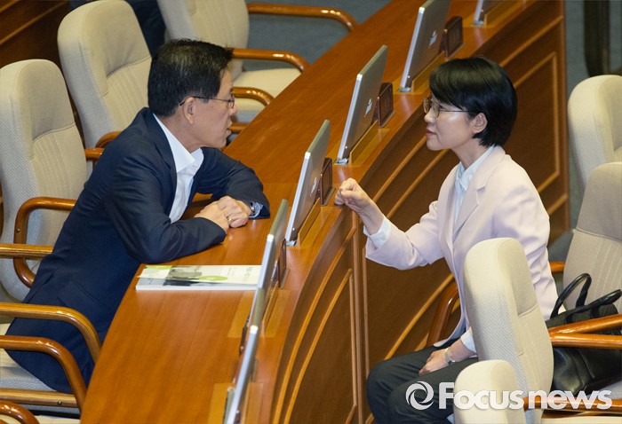 (서울=포커스뉴스) 27일 오후 서울 여의도 국회에서 열린 344회 국회(임시회) 3차 본회의에 참석한 박선숙(오른쪽), 주승용 국민의당 의원이 대화하고 있다.