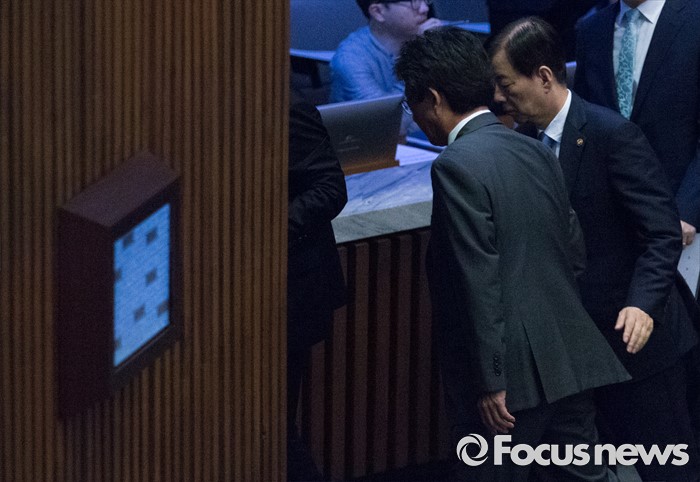 (서울=포커스뉴스) 27일 오후 서울 여의도 국회에서 열린 344회 국회(임시회) 3차 본회의에 참석한 유승민(왼쪽) 새누리당 의원과 한민구 국방부 장관이 대화하며 퇴장하고 있다.