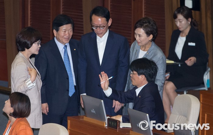 (서울=포커스뉴스) 27일 오후 서울 여의도 국회에서 열린 344회 국회(임시회) 3차 본회의에 참석한 김도읍 새누리당 원내수석부대표와 박완주 더불어민주당 원내수석부대표, 김현미 국회 예산결산특별위원장 등 의원들이 대화하고 있다.