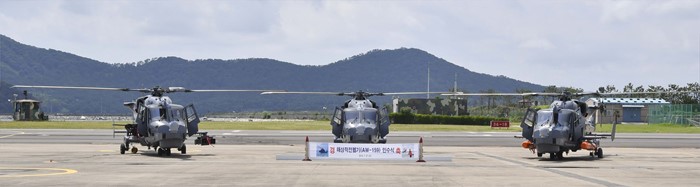 (서울=포커스뉴스) 27일 경남 진해 해군 62전대에서 해군에 인수되는 신형 해상작전헬기(AW-159)가 도열해 있다. <사진제공=해군>