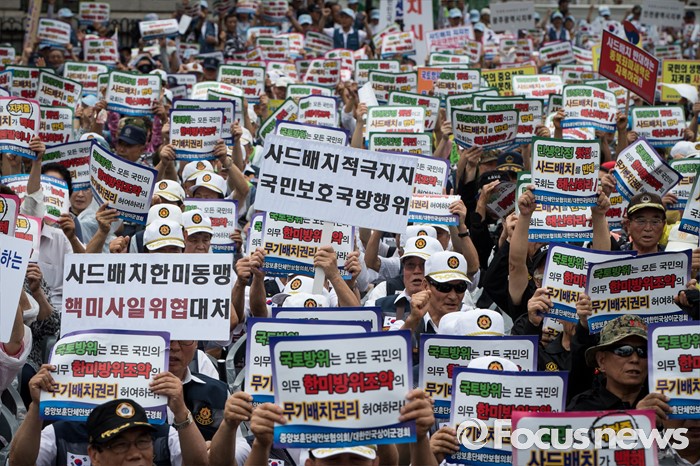 (서울=포커스뉴스) 27일 오후 서울 용산구 서울역광장에서 열린 사드배치 지지 범국민대회 및 자유민주평화통일 결의대회에 중앙보훈단체안보협의회·대한민국상이군경회 회원들이 사드 배치에 찬성하며 손 피켓을 들고 있다.