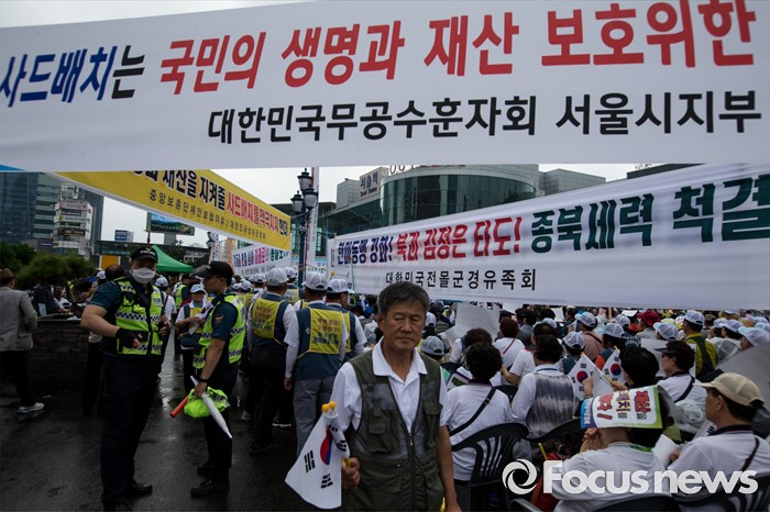(서울=포커스뉴스) 27일 오후 서울 용산구 서울역광장에서 열린 사드배치 지지 범국민대회 및 자유민주평화통일 결의대회에 중앙보훈단체안보협의회·대한민국상이군경회 회원들의 사드 배치 환영 현수막이 걸려있다.