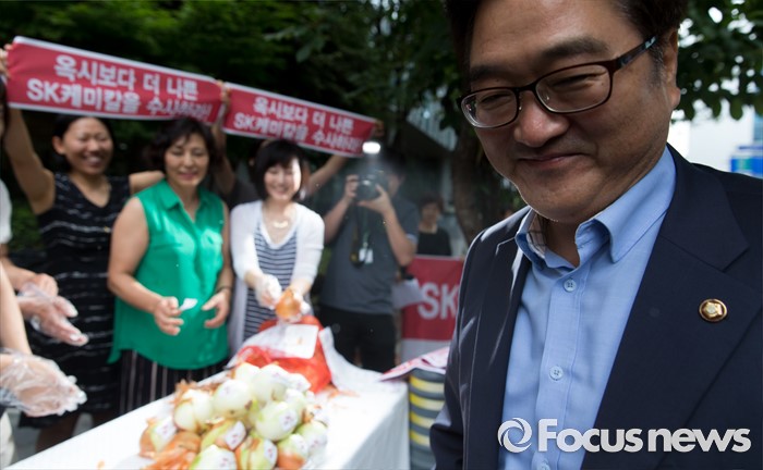 (분당=포커스뉴스) 27일 오후 경기도 성남 분당구 SK케미칼 본사 앞에서 우원식 위원장이 양파 껍질 벗기기 퍼포먼스를 진행하는 가습기살균제 참사 전국네트워크와 인사를 나누고 현장조사장으로 향하고 있다.