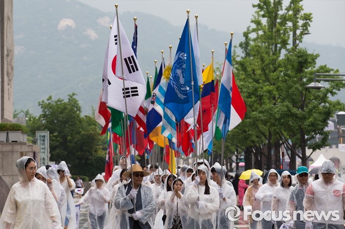 (서울=포커스뉴스) 27일 오후 서울 종로구 세종문화회관 인근에서 월드피스자유연합 관계자들이 6.25전쟁 당시 대한민국 지원 세계 67개국 국기를 들고 퍼레이드를 하고 있다.