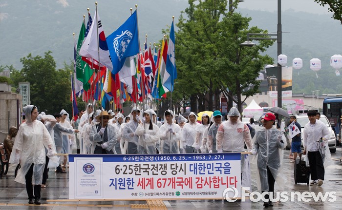 (서울=포커스뉴스) 27일 오후 서울 종로구 세종문화회관 인근에서 월드피스자유연합 관계자들이 6.25전쟁 당시 대한민국 지원 세계 67개국 국기를 들고 퍼레이드를 하고 있다.