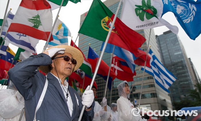 (서울=포커스뉴스) 27일 오후 서울 종로구 세종문화회관 인근에서 월드피스자유연합 관계자들이 6.25전쟁 당시 대한민국 지원 세계 67개국 국기를 들고 경례 하고 있다.