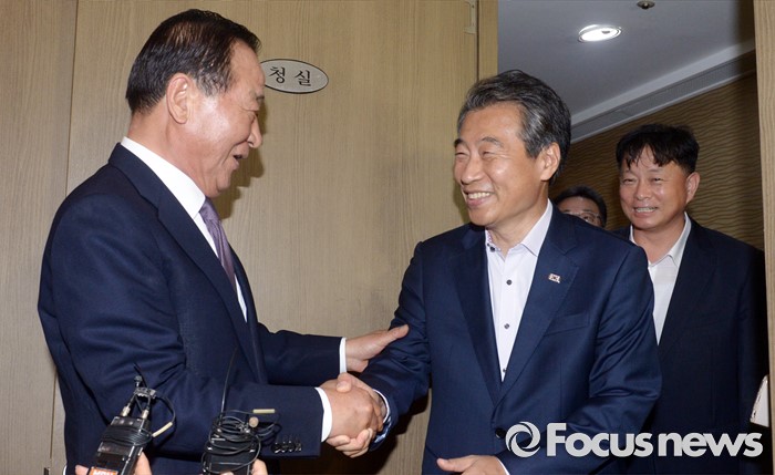 (서울=포커스뉴스) 27일 오후 서울 영등포구 여의도 한 식당에서 열린 친박(친박근혜)계 의원 만찬회동에서 서청원(왼쪽) 새누리당 의원과 정종섭 의원이 인사를 하고 있다.