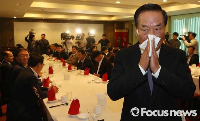 (서울=포커스뉴스) 서청원 새누리당 의원이 27일 오후 서울 영등포구 여의도 한 식당에서 열린 친박(친박근혜)계 의원 만찬회동에 앞서 땀을 닦고 있다.
