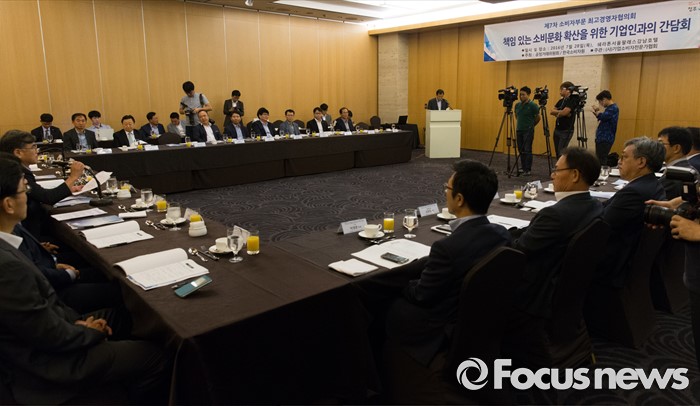 (서울=포커스뉴스) 28일 오전 서울 서초구 쉐라톤 서울 팔래스 강남 호텔에서 '책임있는 소비문화 조성을 위한 기업인과의 간담회'가 열리고 있다.