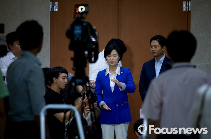(서울=포커스뉴스) 전당대회 출마를 선언한 추미애 더불어민주당 의원이 28일 오전 서울 여의도 국회 정론관에서 당대표 후보등록 기자회견을 마친 뒤 취재진 질문에 답하고 있다.