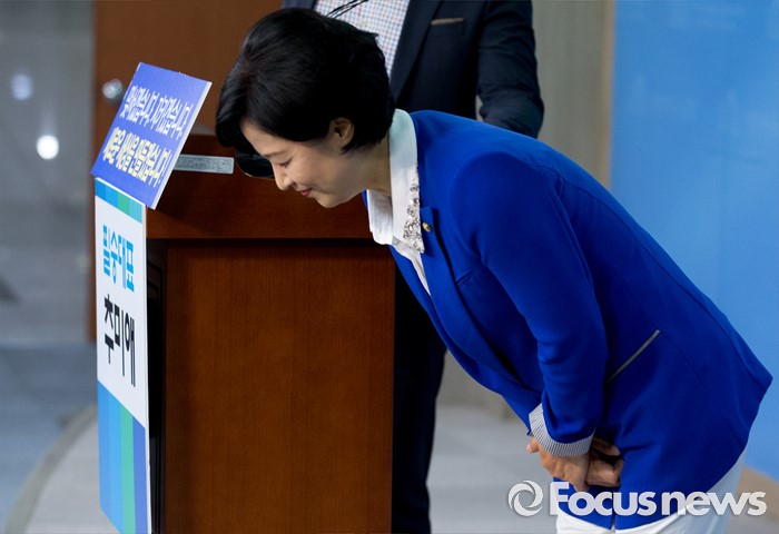 (서울=포커스뉴스) 전당대회 출마를 선언한 추미애 더불어민주당 의원이 28일 오전 서울 여의도 국회 정론관에서 당대표 후보등록 기자회견에 앞서 인사하고 있다.